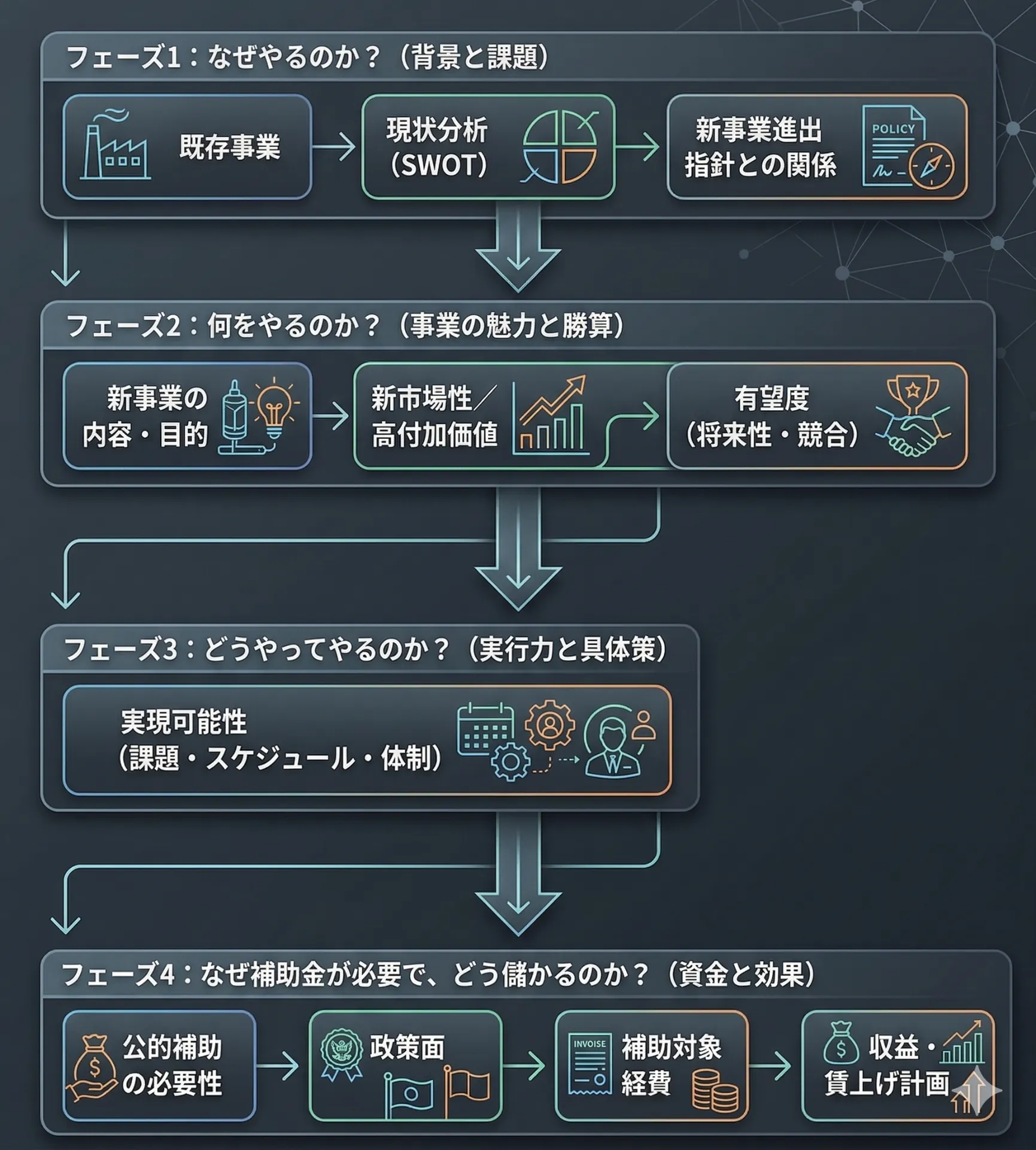 フェーズに分けて事業計画書の構成を検討し策定を進めます。